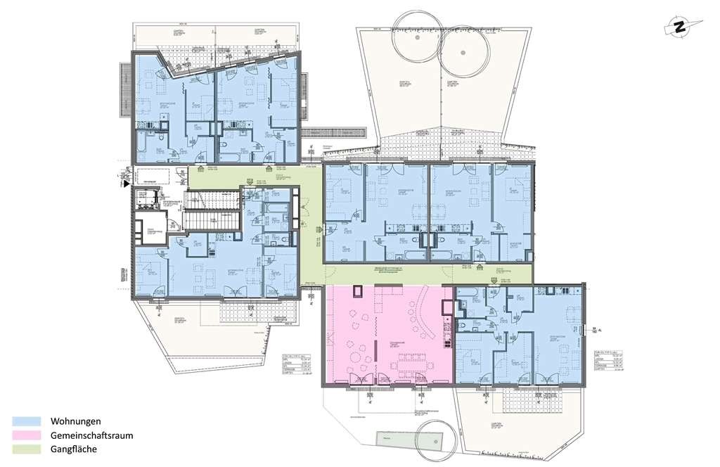 Dieses spezielle Wohnangebot befindet sich im EG in der Projektmitte mit einem attraktiven Gemeinschaftsraum (Küche u. Wohnzimmer/Lounge) sowie einer großen Terrasse. Gemeinschaftsraum und Terrasse werden von den Cluster-Haushalten gemeinsam genutzt und über die Wohnungsmiete finanziert. Die Cluster-Wohnungen sind freifinanziert.